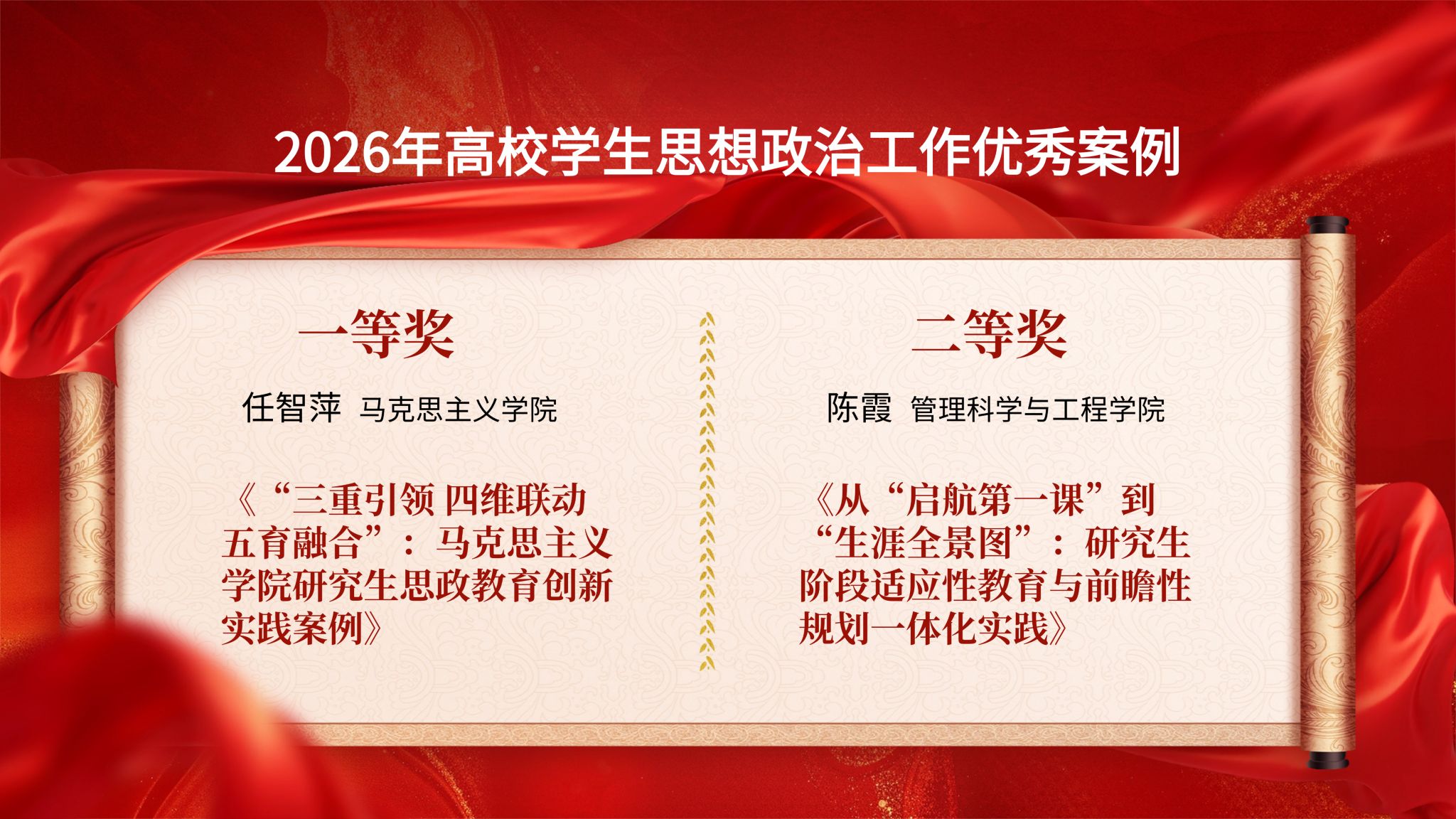 近日,教育部高校思想政治工作队伍培训研修中心(南昌大学)公布2026年高校学生思想政治工作优秀案例征集活动评选结果,我校两篇案例从全国2485篇作品中脱颖而出,荣获佳绩。其中,马克思主义学院辅导员任智萍撰写的《“三重引领 四维联动 五育融合”:马克思主义学院研究生思政教育创新实践案例》荣获一等奖;管理科学与工程学院党委副书记陈霞撰写的《从“启航第一课”到“生涯全景图”:研究生阶段适应性教育与前瞻性规划一体化实践》荣获二等奖。