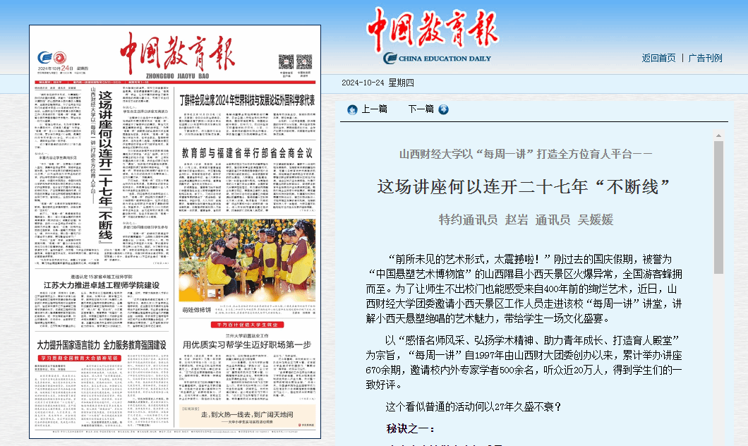 “前所未见的艺术形式,太震撼啦!”刚过去的国庆假期,被誉为“中国悬塑艺术博物馆”的山西隰县小西天景区火爆异常,全国游客蜂拥而至。为了让师生不出校门也能感受来自400年前的绚烂艺术,近日,山西财经大学团委邀请小西天景区工作人员走进该校“每周一讲”讲堂,讲解小西天悬塑绝唱的艺术魅力,带给学生一场文化盛宴。