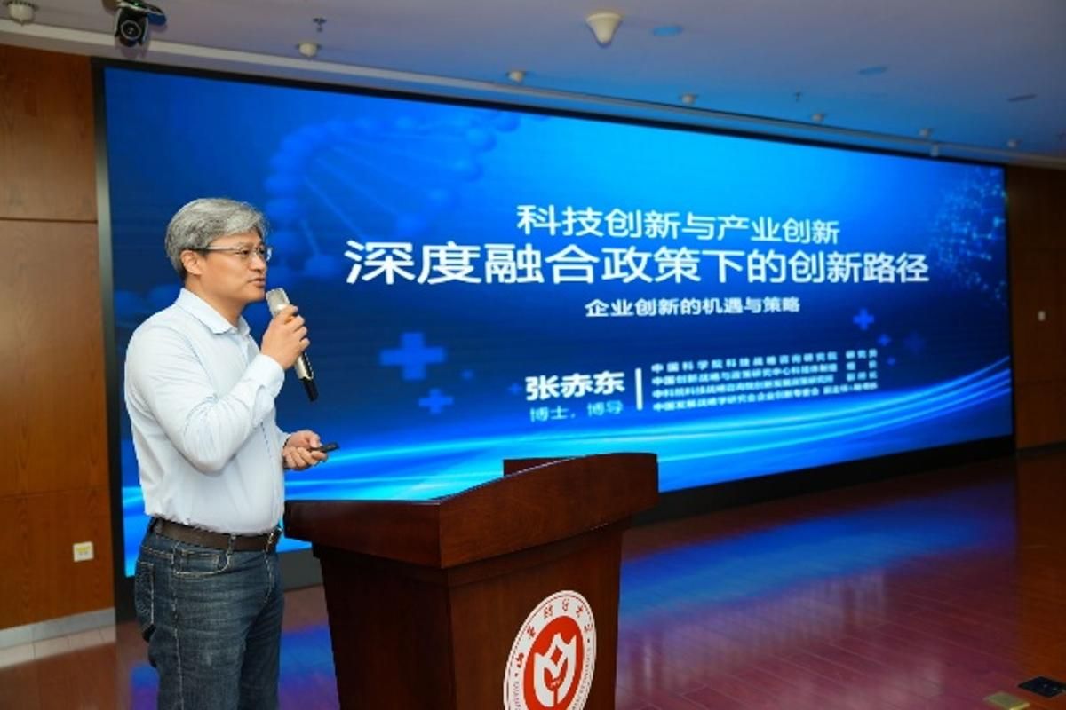 会议期间,澳大利亚西澳大学吴延瑞教授通过线上连线,以《企业外部研发战略:技术联盟还是技术收购?》为题,分享了其团队的最新研究成果,指出技术联盟是企业突破创新瓶颈、提升技术竞争力的重要组织形式。中国科学院科技战略咨询研究院张赤东研究员,聚焦“科技创新与产业创新深度融合政策下的创新路径”,系统梳理了科技创新驱动产业创新的基本路径与模式,并结合数字经济时代的新范式,深入阐释了企业科技成果转化的重要性和技术创新的“三梁五柱”政策体系。