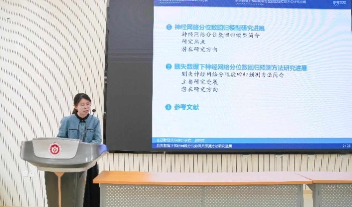 郝瑞婷老师作了题为《删失数据下神经网络分位数回归预测方法研究》的报告。报告中,她首先介绍了神经网络分位数回归模型及删失数据下相关预测方法的研究进展;随后,提出删失神经网络分位数回归预测方法,并详细阐述了该方法的基本思想与迭代步骤;最后,她指出,未来可从高维数据预测、可解释性预测等方向进一步完善删失数据下神经网络分位数回归预测方法。