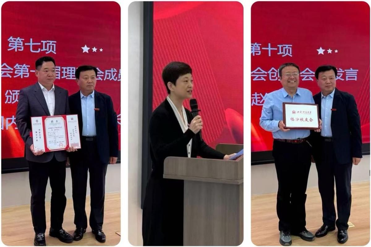 国内交流合作部(校友工作办公室)部长董军伟宣读临汾校友会第一届理事会成员批复名单,颁发聘书并授牌;国内交流合作部副部长、校友工作办公室主任潘敏宣读关于成立临汾校友会的批复。