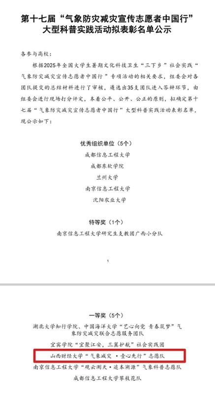 为深入学习贯彻习近平总书记关于气象工作的重要指示精神和关于科学普及的重要论述精神,宣传贯彻新修订的《中华人民共和国科学技术普及法》,引导高等学校青年师生志愿开展气象科普活动,增强公众气象防灾减灾救灾和应对气候变化意识,中国气象局、教育部、共青团中央、中国科协组织高校联合开展第十七届“气象防灾减灾宣传志愿者中国行”活动。自今年6月团中央“气象防灾减灾宣传志愿者中国行”活动启动以来,管理科学与工程学院“气象减灾 壹心先行”志愿队依托应急管理专业开展了系列活动,最终荣获全国一等奖。