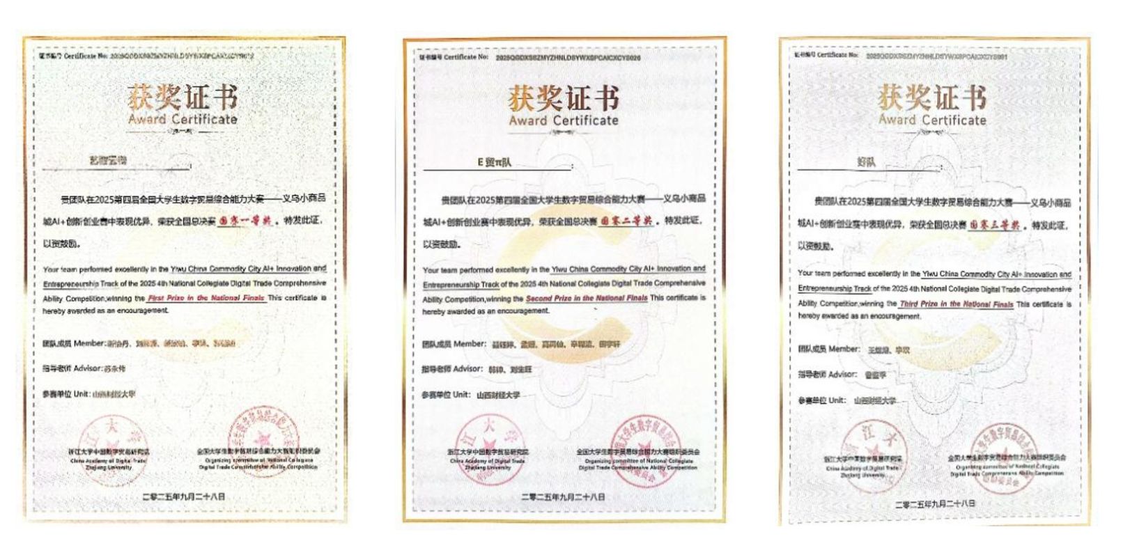 经过激烈角逐,我校共有3支队伍闯进全国总决赛,指导教师和主力队员全部来自我校国际贸易学院。最终,由苏永伟副教授指导的“艺数云链”团队凭借出色的贸易分析与运营能力斩获一等奖,由韩帅副教授指导的“E贸π队”团队荣获二等奖,由曹监平老师指导的“好队”团队获得三等奖,辅导员孙梦霞老师进行了现场指导。