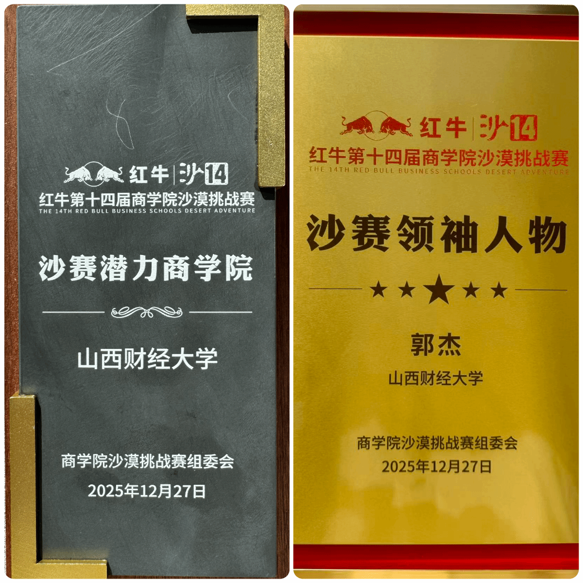 近日,第十四届商学院沙漠挑战赛领队会议暨年度颁奖典礼在安徽省合肥市举行。工商管理学院凭借其在赛事组织、团队传承与卓越表现方面的突出潜力,荣获赛事官方颁发的“潜力商学院”奖项。同时,我校沙14领队,2024级MBA学生郭杰与沙15领队,2018级MBA校友马强被授予个人最高荣誉“沙赛领袖人物”称号。