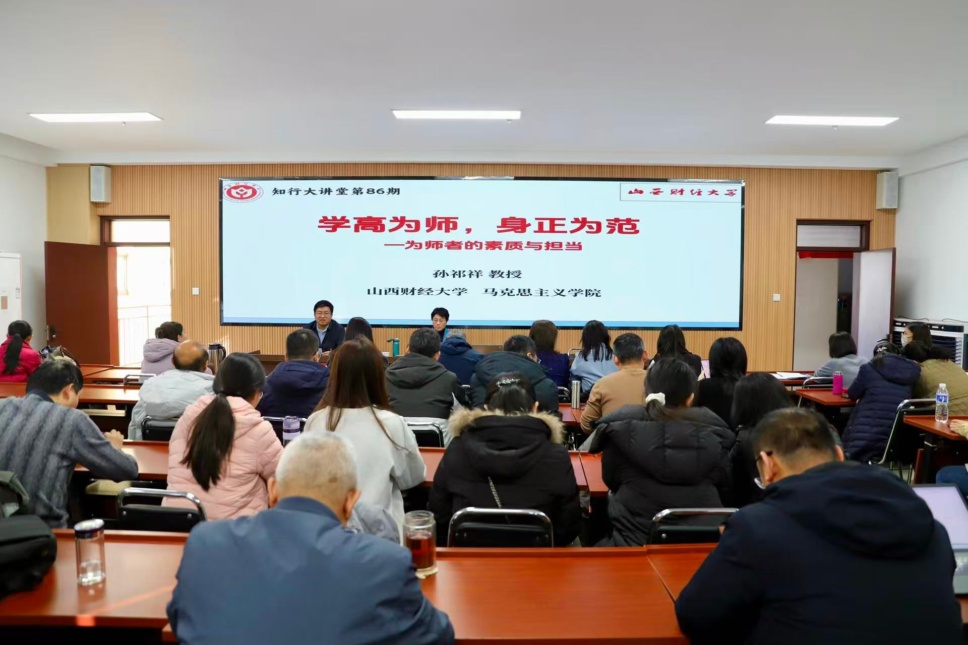 11月25日下午,由山西省马克思主义理论教育基地、马克思主义学院主办的知行大讲堂第86期在学院会议室举行。北京大学经济学院原院长孙祁祥教授受邀作“学高为师,身正为范——为师者的素质与担当”为主题的学术讲座。马克思主义学院院长杨茂林、党委书记马晓娟参加讲座。讲座由马克思主义学院副院长郭永园主持,学院全体教职工参加学习。