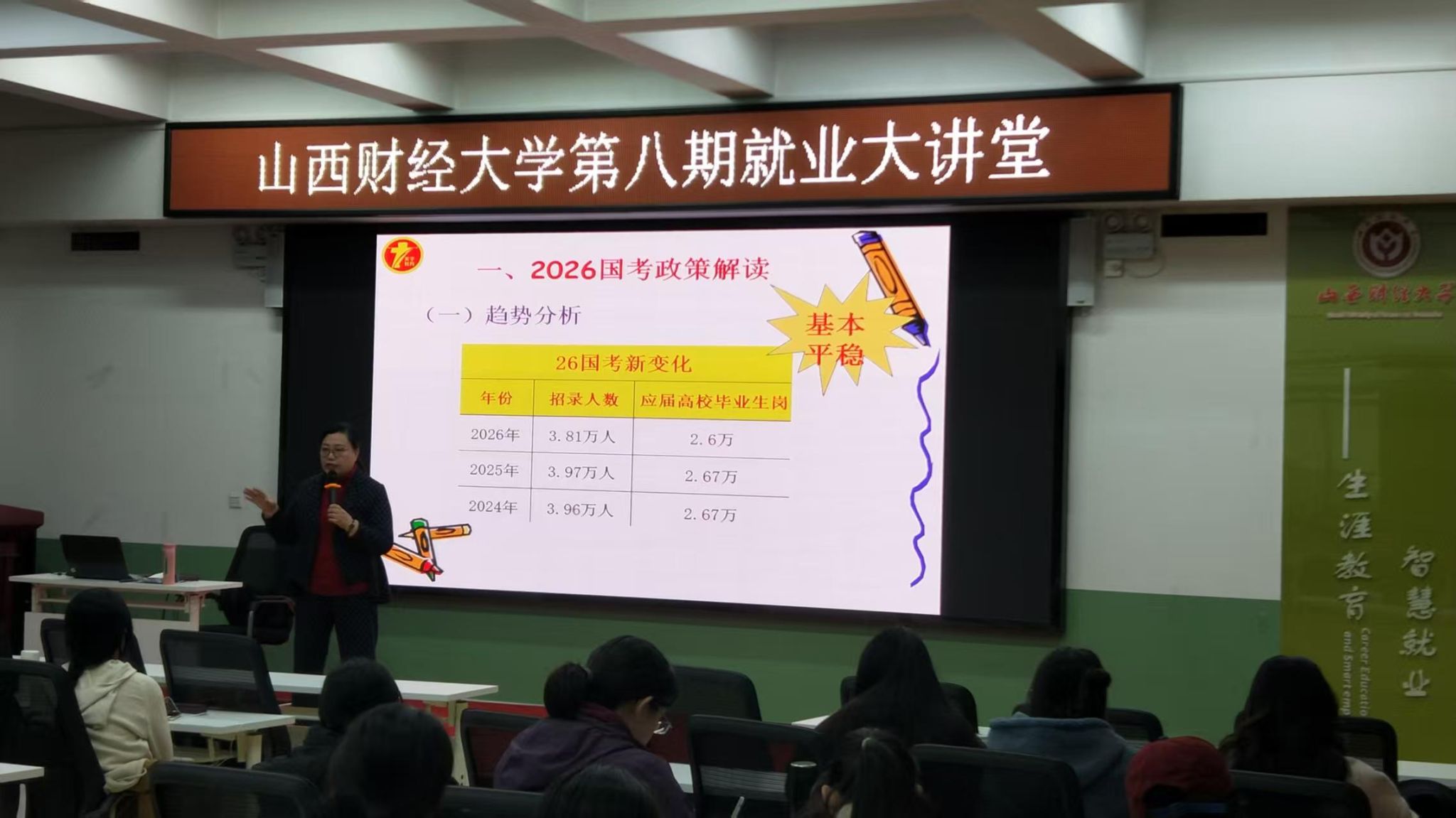 本次讲座邀请太原市委党校科研部主任、公共管理学教授韩艳萍担任主讲嘉宾。韩教授长期致力于公共管理研究,理论功底深厚,实务经验丰富。她围绕2026年国考最新趋势,系统解读了招考公告、报考流程、山西地区优质岗位选择等关键内容,重点分享了“六步报考法”,指导学生如何结合自身条件,利用专业、地域、身份等限制因素科学筛选岗位、提升上岸成功率。此外,韩教授还结合历年真题,对行政职业能力测验、申论等科目的考情变化与备考策略进行了深入分析,为同学们构建系统复习框架提供了清晰指引。