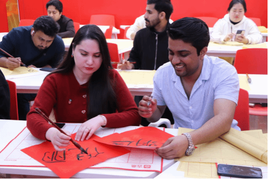 韩国籍和越南籍学生结合自身学习经历,分享“我的中文学习体会”,他们通过中文歌曲、影视片段和电子游戏积累词汇、感悟语境;巴基斯坦籍学生和阿富汗籍学生用中文“诵读中国”,朗诵了《春江花月夜》《送别》《致橡树》《月光下的中国》等经典诗篇,他们发音标准、情感真挚,抑扬顿挫间传递出诗意中文的韵味与力量;最后,国际学生们用毛笔书写自己的中文名字,在笔墨流转间亲身感受汉字的形态之美、结构之妙。国际学生们纷纷表示:“中文,是我们追逐梦想的“金钥匙”,我们通过中文唱中国歌、做中国菜、畅游中国、体验地道的中国传统文化。”