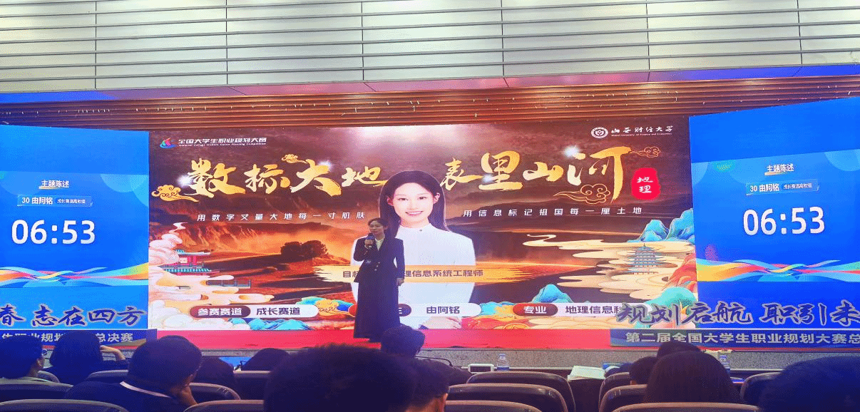 决赛现场,由阿铭以“数标大地,表里山河——立志成为一名地理信息系统工程师”为主题,生动展示了自己通过系统学习和实践磨炼,逐步提升能力素质,追逐职业目标的成长历程。在主题陈述、评委提问和天降Offer三个环节中,由阿铭沉着应对,与来自全国的优秀选手同台竞技,赢得了评委、心选团和观摩团的高度认可,获得全国银奖的好成绩。