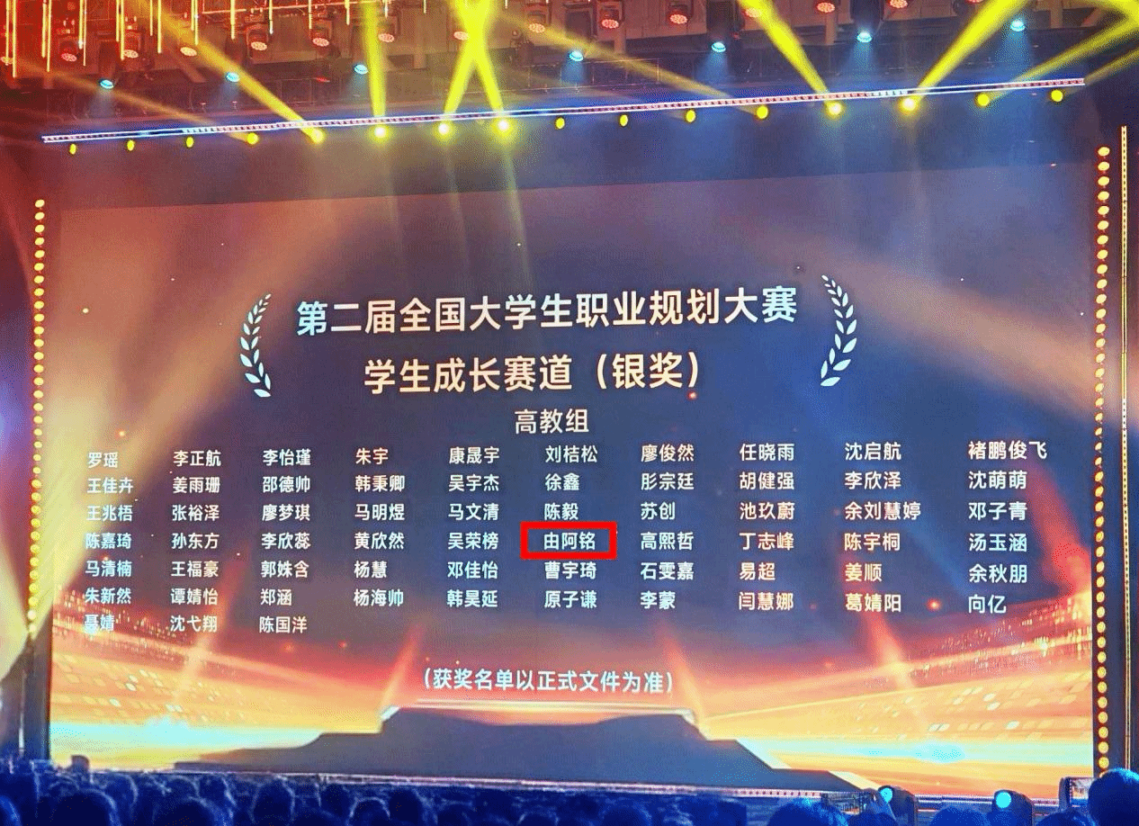 4月16日至19日,第二届全国大学生职业规划大赛总决赛及颁奖仪式在长沙举行。教育部党组书记、部长怀进鹏向大赛发表视频致辞,湖南省委书记、省人大常委会主任沈晓明,湖南省委副书记、省长毛伟明,教育部党组成员、副部长熊四皓,中南大学党委书记易红等领导出席颁奖仪式。我校资源环境学院2022级地理信息科学专业本科生由阿铭凭借出色表现,荣获成长赛道高教组全国银奖,这是我校首次入围该项赛事全国总决赛并实现国赛奖项零的突破。